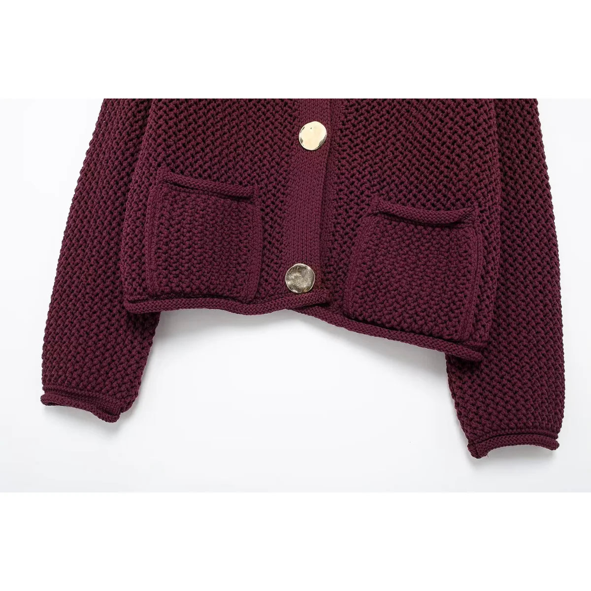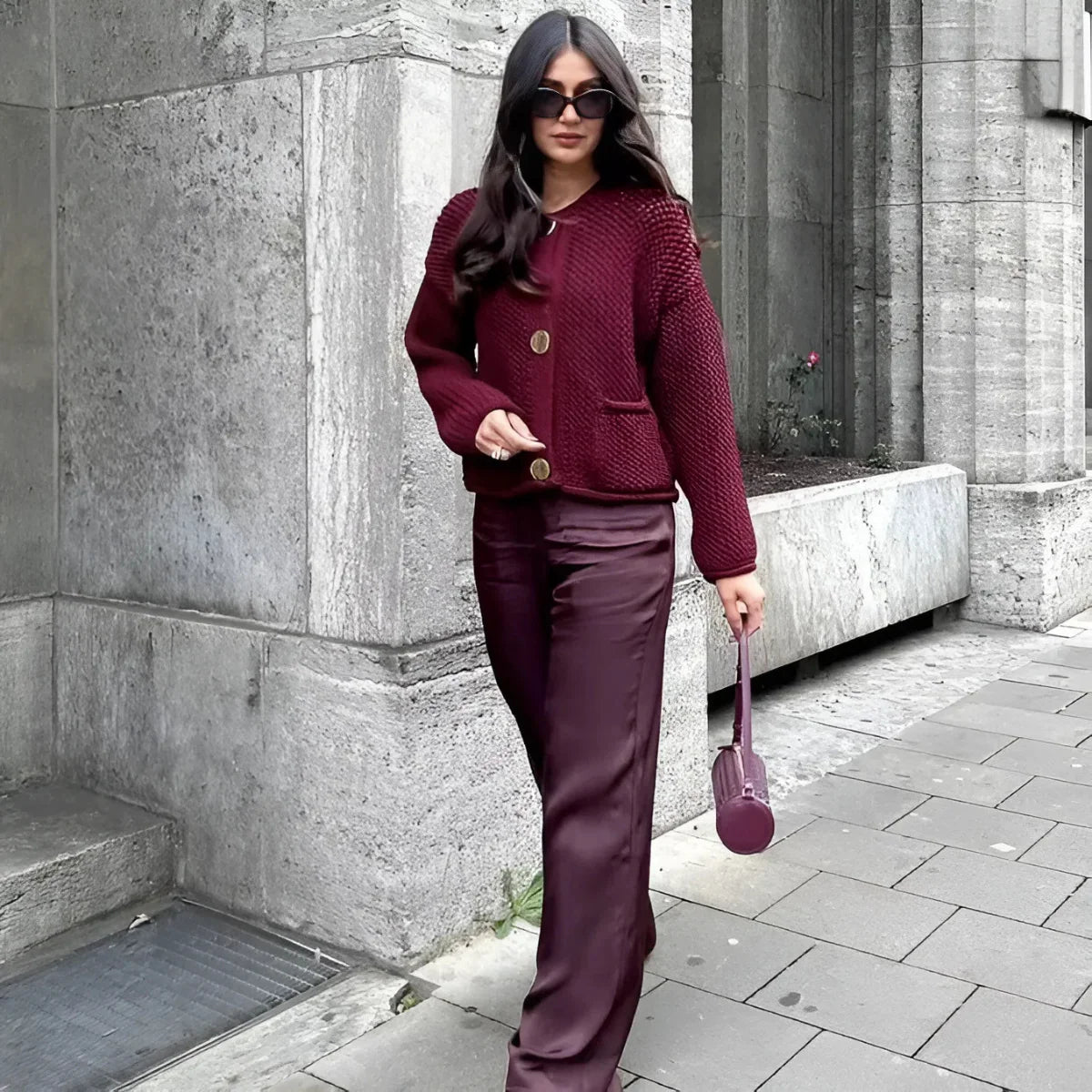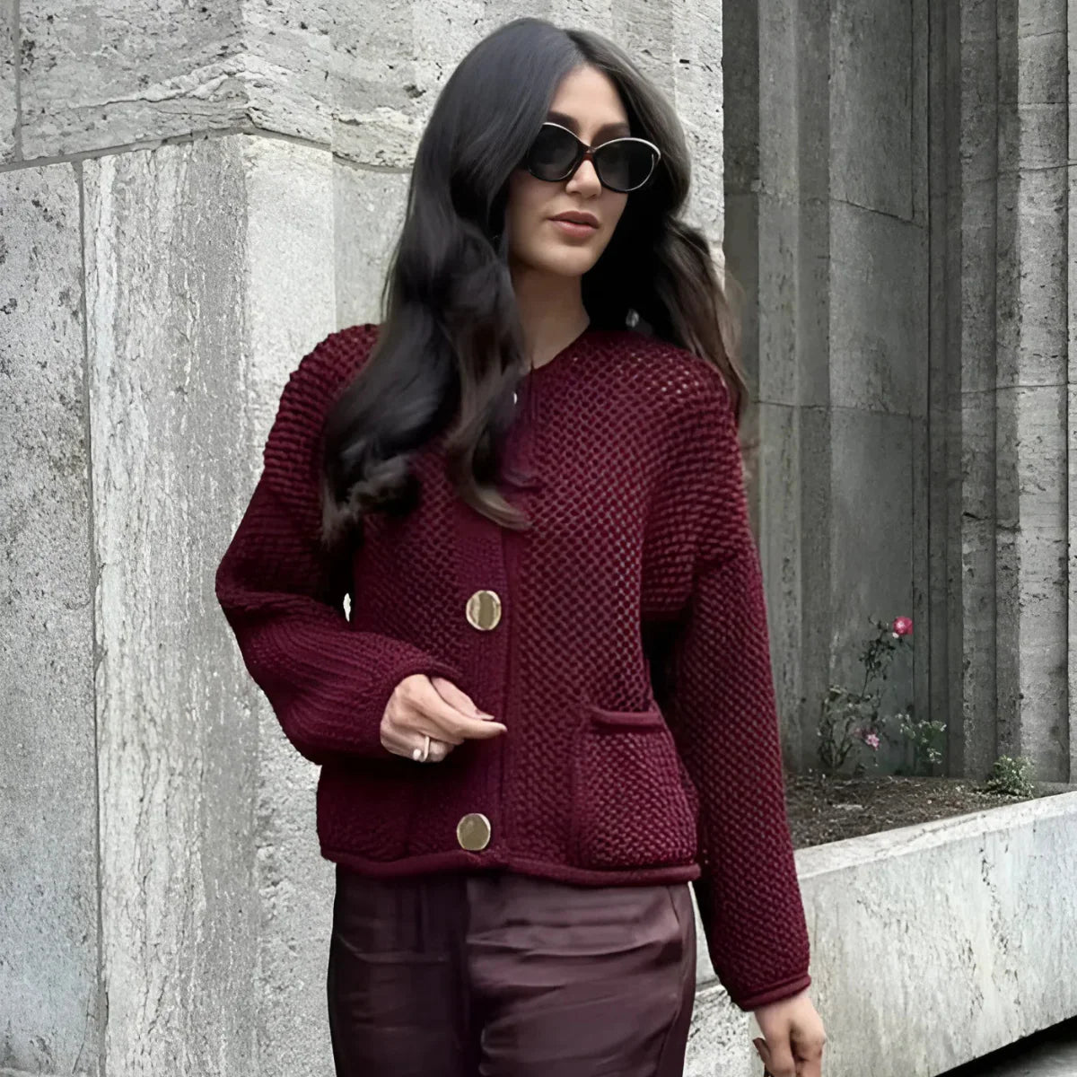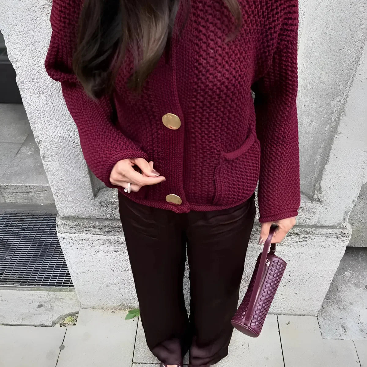 Elma-koftan kombinerar stilren struktur med praktiska detaljer. Den grovstickade ytan och de dekorativa stora knapparna ger ett uttryck som känns både elegant och avslappnat – perfekt för kalla dagar med stil.