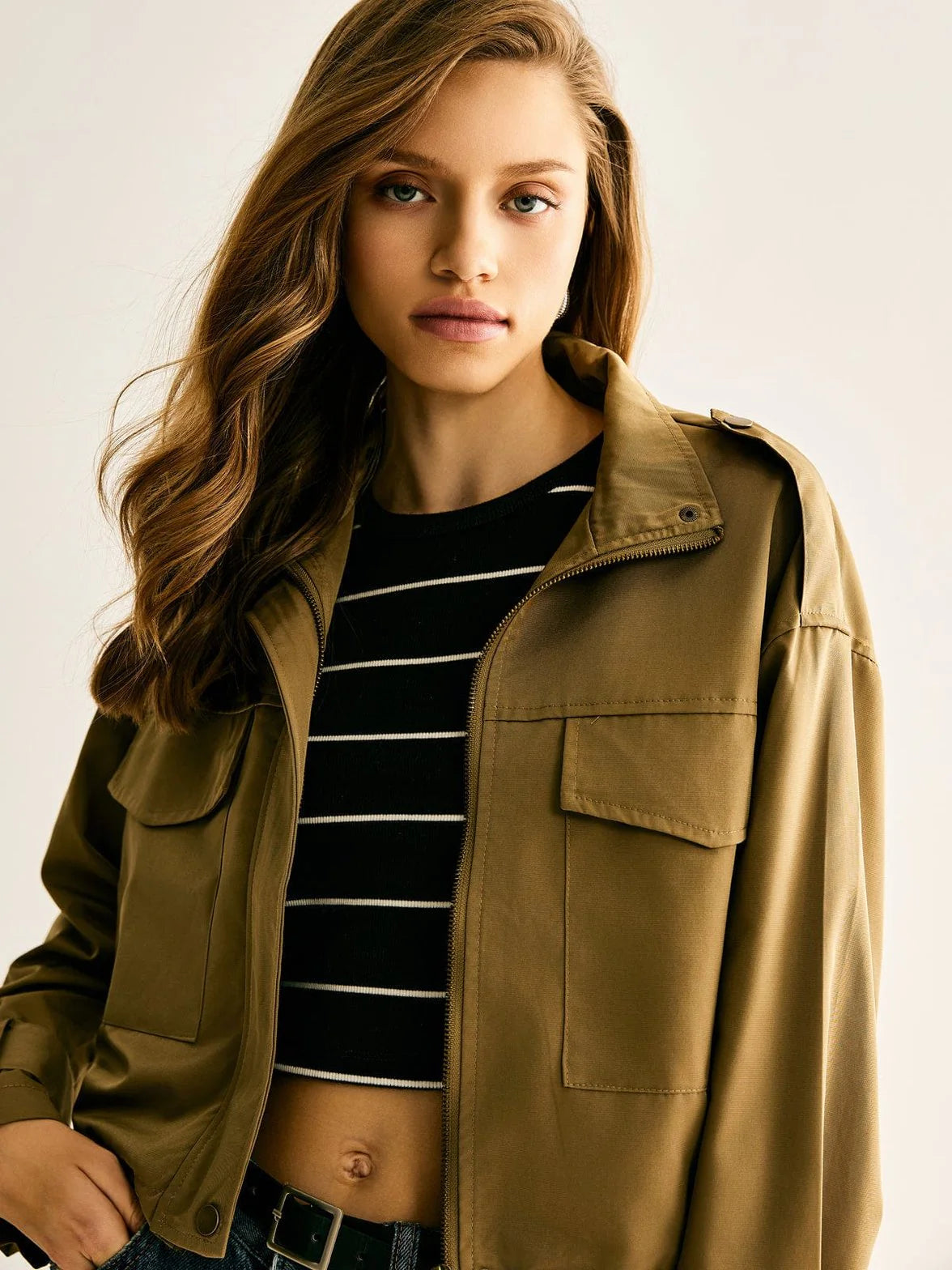 Jackan Lina erbjuder en modern tolkning av utilitystilen med sin korta skärning, strukturerade silhuett och praktiska fickor. Perfekt för en avslappnad men trendmedveten look – från stadspromenader till fikahäng.