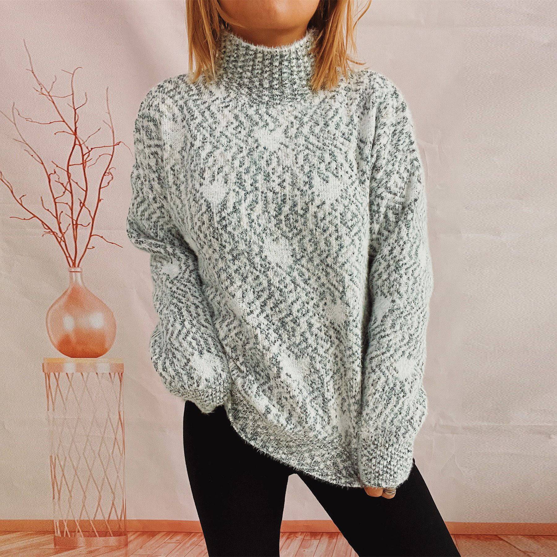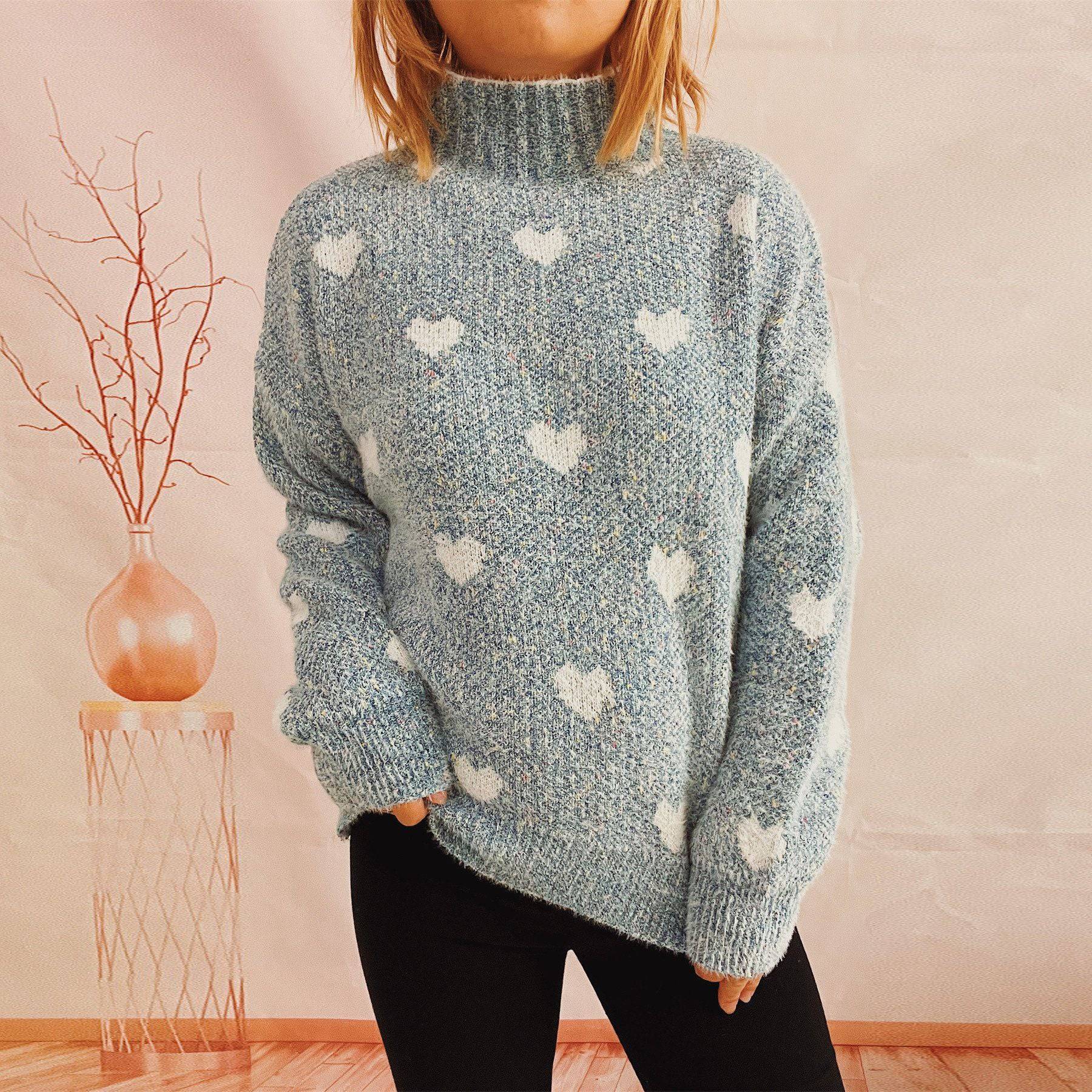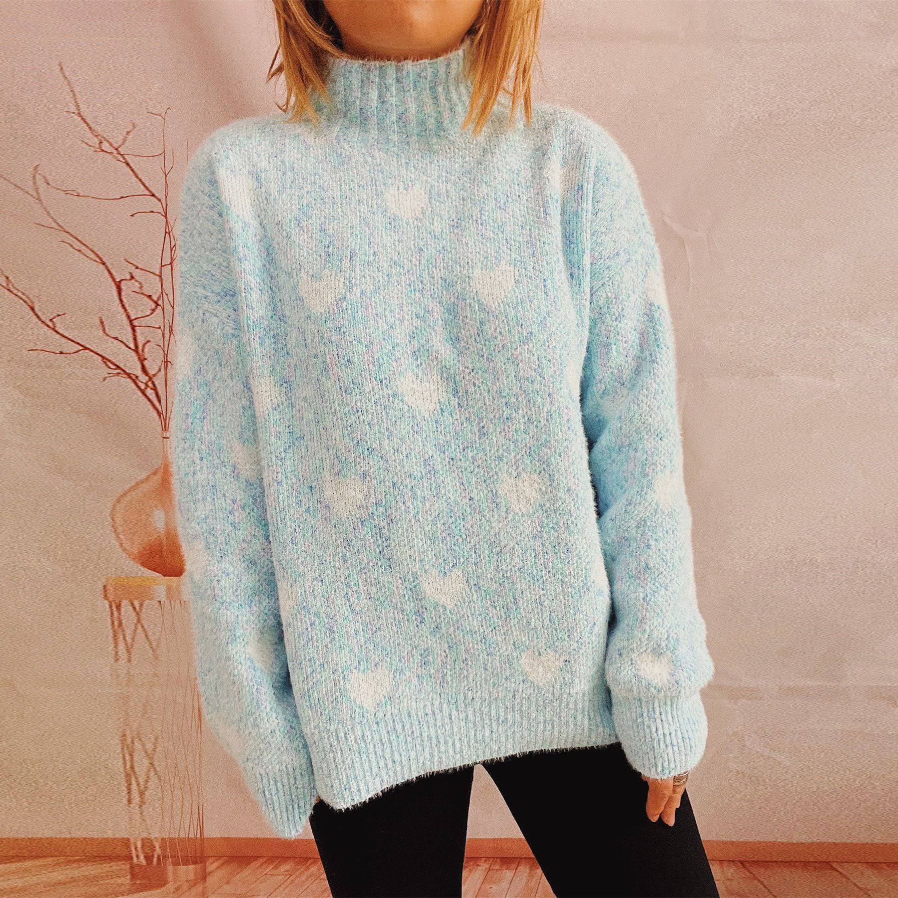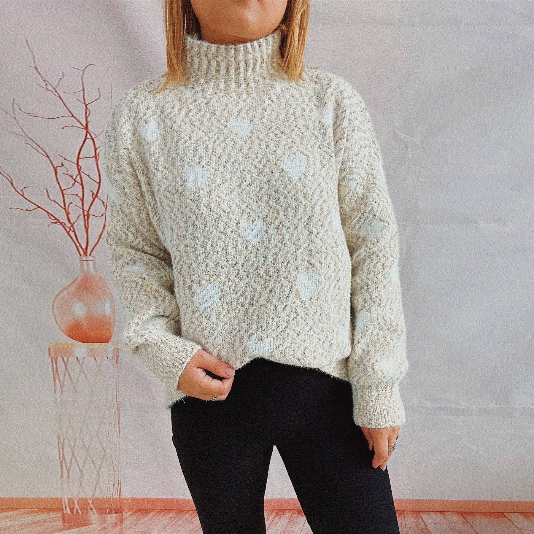 Mira | Stickad Tröja med Hjärtmönster och Hög Krage